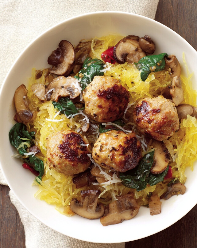 - Time to Serve!The best part! Divide your warm, golden spaghetti squash noodles among 8 bowls or plates. Generously ladle the savory turkey meatballs and that incredible mushroom-spinach sauce over the top. Finish each masterpiece with a sprinkle of the remaining 3 tablespoons of grated Parmesan cheese. Serve immediately and prepare for rave reviews!