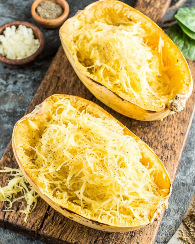 - Spaghetti Squash: 2 medium (approx. 3 pounds each / 1.36 kg each), halved lengthwise and seeded. Tip: Pick squash that feel heavy for their size for the best “noodle” yield!