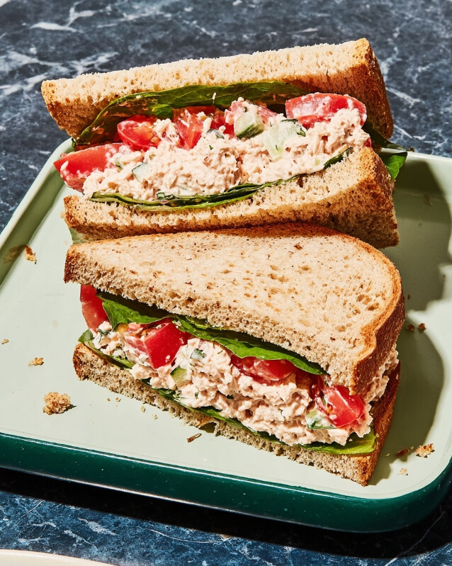 Tomatoes and cucumbers release water, especially after being salted. To keep your bread from getting soggy, use the lettuce leaves as a shield. Place the lettuce directly on the bread first, then the tuna mixture, then another piece of lettuce, and finally the top slice of bread.