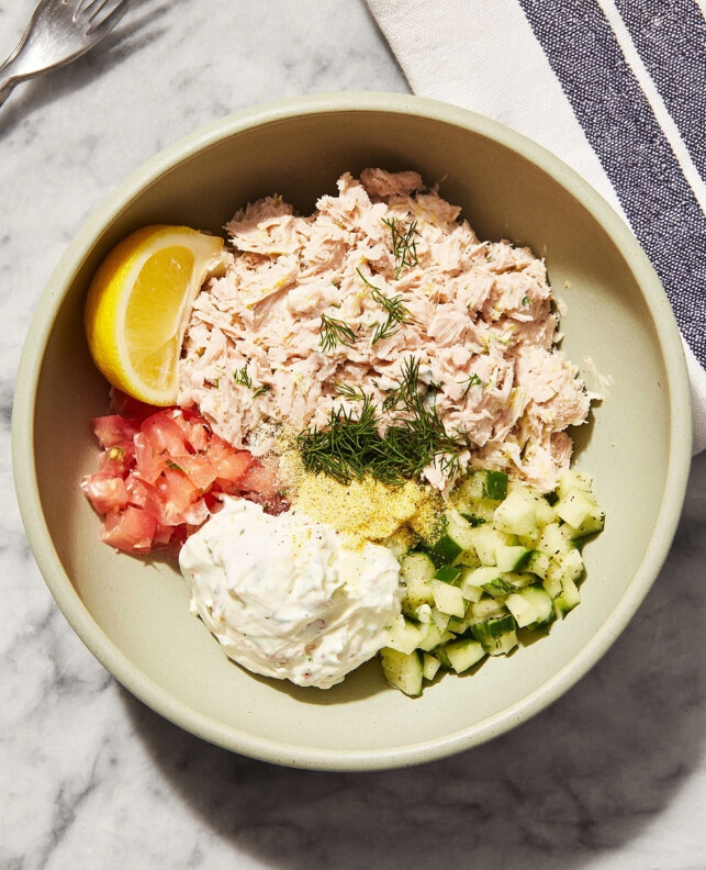 - Combine Base Ingredients: In a medium mixing bowl, flake the thoroughly drained tuna with a fork to separate the chunks. Add the Greek yogurt, diced tomatoes, diced cucumber, and chopped fresh dill.