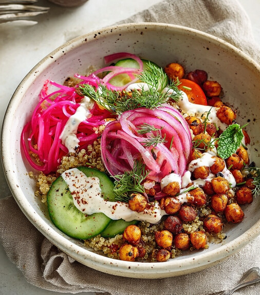 - Arrange and Serve: Now for the fun part! Artfully arrange the crispy chickpeas, cucumbers, and tomatoes over the quinoa. Add your sliced avocado, then garnish generously with the pickled shallots, fresh herbs, and a final, vibrant dusting of sumac. Drizzle with the lemon-tahini dressing right before you dig in. Enjoy!