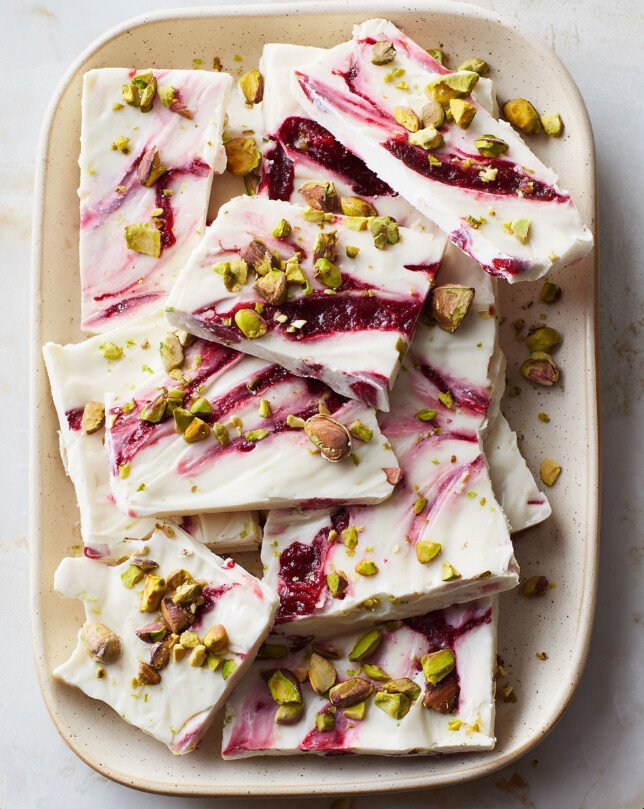 DASH-Friendly Strawberry-Rhubarb Pistachio Yogurt Bark