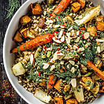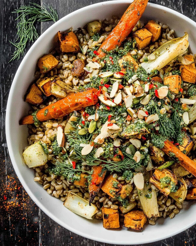 - Assemble the Bowls: Divide the warm farro evenly among 7 bowls. Top each with 1 cup of the roasted mixed root vegetables.