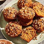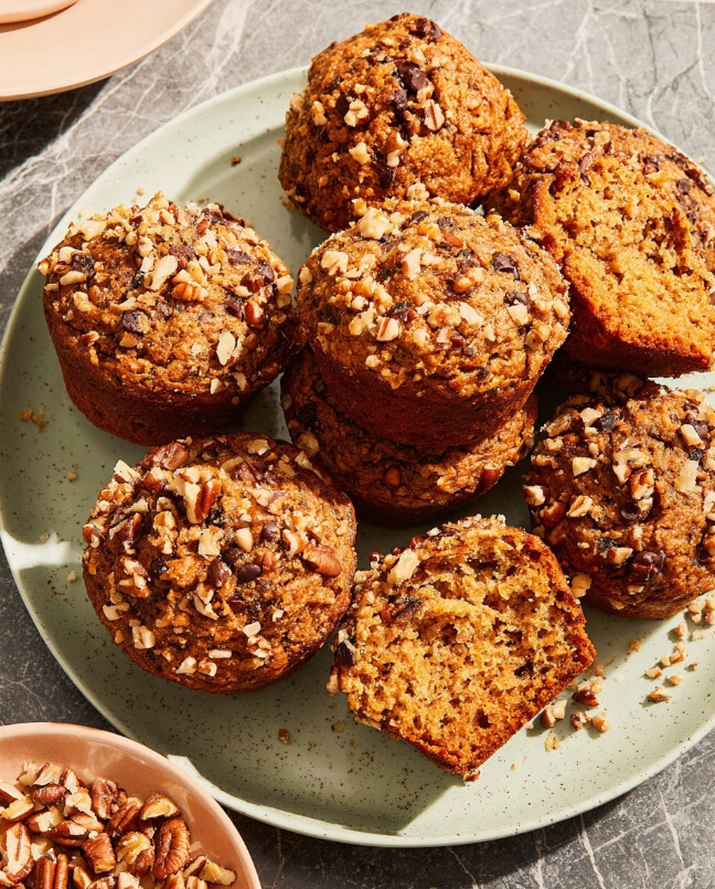 - Portion and Bake: Divide the batter evenly among the 16 prepared muffin cups; they will be very full. Sprinkle the toasted pecans evenly over the tops. Bake for 22–28 minutes, or until the tops are domed and a wooden skewer inserted into the center of a muffin comes out with moist crumbs attached, but no wet batter.