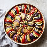 • Stage 4: Arrange the seasoned vegetables over the chickpea-tomato base in tight, overlapping concentric circles. Pour any residual oil and herb mixture over the top.