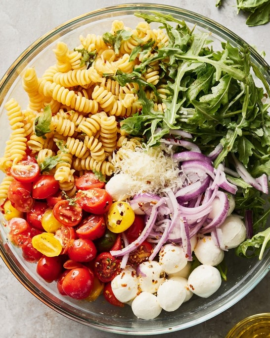 • Combine Ingredients: In a large mixing bowl, combine the cooled pasta, halved cherry tomatoes, sliced red onion, and torn basil leaves. Pour about two-thirds of the vinaigrette over the salad and toss gently to coat everything evenly.